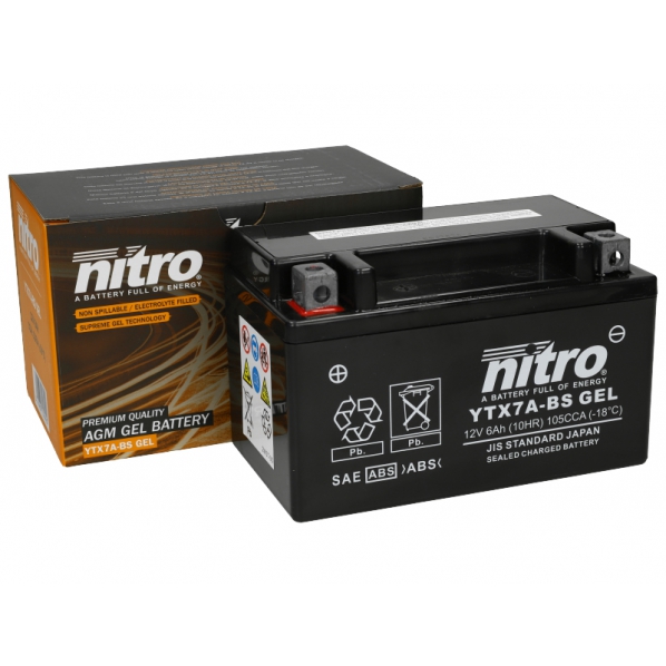 Batterie Nitro YTX7A-BS Gel 12V 6AH (wartungsfrei) Abmessungen HxBxT: 94x150x87mm Steckertyp: A