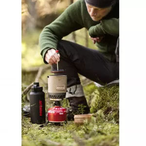 Der All-in-One-Kocher. Mit der perfekten Triangle Joint-Verbindungstechnik für Kocher und Topf sowie dem Laminar Flow-Brenner für niedrigen Schwerpunkt. Die Kombination erzielt eine extrem hohe Effizienz und bietet bei niedrigem Gewicht eine vollwertige Möglichkeit auf Solotour zu kochen oder für 2 Personen jederzeit für warme Getränke oder Suppe zu sorgen. Die mit Filz isolierte Hülle aus G-1000® verbessert die Thermobilanz und schützt vor Verbrennungen. Der Kocher kann auch hängend betrieben werden (z. B. im Biwak) und der Deckel ist gleichzeitig auch eine kleine Tasse. Zum Transport passt neben dem Kocher eine 100-g-Gaskartusche in den 0,5 Liter fassenden Topf aus hart exoliertem Aluminium. Auch ein Standfuß für sicheren Betrieb gehört zum Lieferumfang.