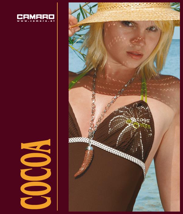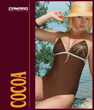 Der Cocoa von Camaro ist ein Einteiler der optisch aufgepeppt wird durch das abgesetzte weiße Band unterhalb der Brust. Anders als gewönliche Einteiler, die schnell langweilig und brav wirken, bietet der Cocoa diesen Eyecatcher, der die Aufmerksamkeit nach "oben" zieht. Dazu noch die hellgrünen Bändchen und das Design auf der Brust, fertig ist ein typischer Camaro, ein echter Hingucker am Strand.