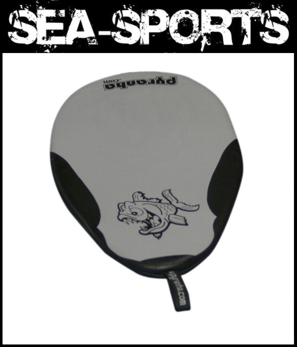 Hergestellt aus 4mm Neopren in Tauchqualität, mit einem eng anliegendem, festsitzenden Spanngurtgummi, einer Griffschlaufe und oben auf prangt der wütendene Fisch, die wir alle kennen und lieben.