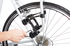 Gummibeschichtete Klemmen sorgen für sicheren Halt des Trägers auch bei schweren Lasten, verhindern ein Abrutschen und schützen den Fahrradrahmen.