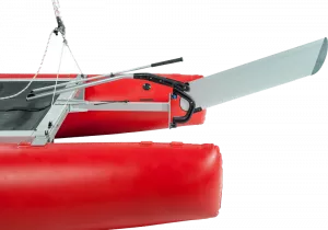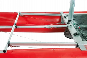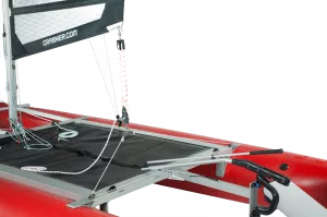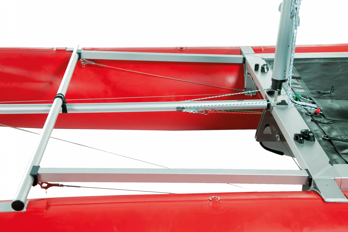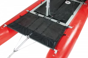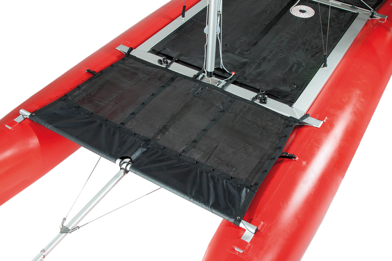 Die serienmäßige Querstrebe stabilisiert die Rümpfe im Bugbereich. Das optionale Bugverdeck vergrößert die Nutzfläche, dient bei schneller Fahrt als Spritzschutz und zur Befestigung von Gepäck – bei Flaute und in „faulen Urlaubs-Momenten“ auch zum Liegen und Sonnen! Dank der festen Querstrebe ist das bequeme Einsteigen übers Bugverdeck möglich.