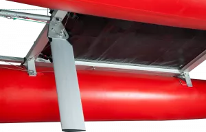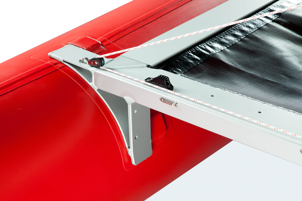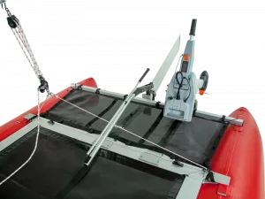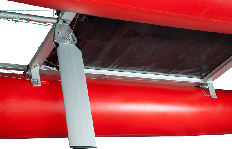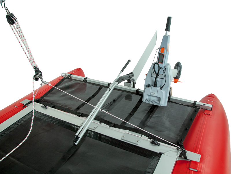 Rumpf und Rahmen sind über Einstecklaschen fest und stabil verbunden, der viereckige Spezial-Profilrahmen mit eckigen Steckverbindungen bietet hohe Torsionsstabilität ohne Verdrehen. Das Trampolintuch wird komfortabel und direkt im Profilrahmen formschlüssig eingezogen und bietet viel Platz für gutes Sitzen. Am salzwasserfest eloxierten Aluminium-Rahmen kann ein kräftiger 6 PS Motor fixiert werden, der den Schlauchboot-Katamaran auf rasante 25 km/h beschleunigt.