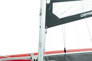 Nie wieder Kopf anstoßen: Der moderne Katamaran Großsegel-Schnitt ohne Baum sorgt für mehr Segelfläche und weniger Verwirbelung – und dafür, sich nie mehr den Kopf zu stoßen. Dickes Dacron Segeltuch und große verstärkte Fenster verleihen Steifigkeit und gute Rundumsicht.