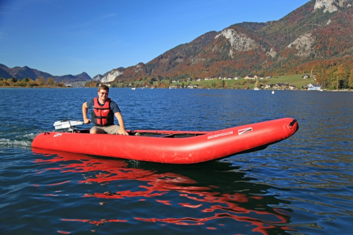 In außergewöhnlicher Form gleitet es deutlich schneller übers Wasser als herkömmliche Boote mit gleicher Motorleistung. Was für ein Gefühl, mit 10 PS rasant und doch ruhig mit über 30 km/h dahin zu flitzen!