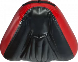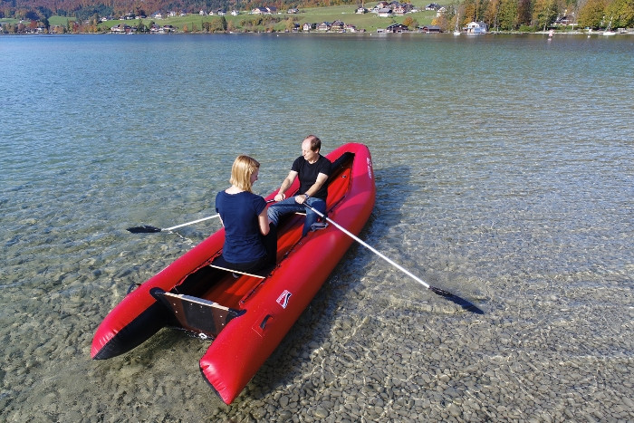Damit die Seitenschläuche ähnlich wie bei einem Katamaran eine gute Auflagefläche bieten und Sie besser dahinfliegen, ist der Boden dazwischen leicht nach innen gesetzt. Die ideale Form für Kippstabilität und leichten Lauf.
