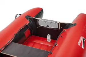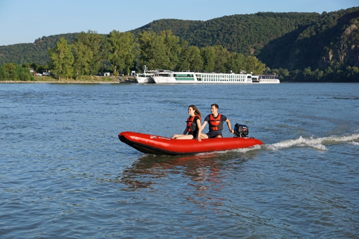 Die Länge von 450cm hält das Boot stabil auf Kurs und verleiht ihm einen wesentlich ruhigeren Lauf als bei Motorschlauchbooten üblich. Dafür sorgt auch der flach hochgezogene Bug, der gut über Wellen gleitet, wenig Windangriffsfläche bietet und Spritzwasser reduziert. Am Bug dient ein Gurtgriff zum Tragen und Festbinden.