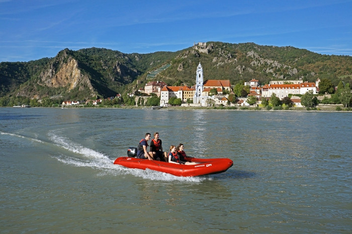 Dicke Seitenschläuche verleihen dem Boot sehr hohe Steifigkeit, die Gesamtbreite von 170 cm steigert die Kippstabilität - auch beim Einsteigen vom Wasser aus. Die durchgehende Innenbreite von 80 cm bietet 6 Passagieren und umfangreicher Ausrüstung Platz.
