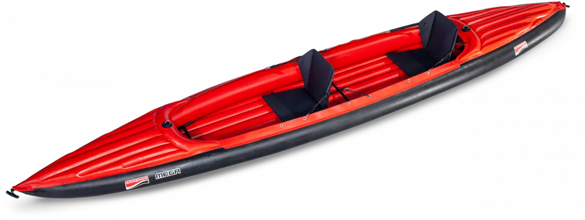 Flach, lang, breit. Das MEGA läuft super leicht, bietet Wind wenig Angriffsfläche und auch kräftigen Personen oder zwei Kindern nebeneinander ausreichend Platz. Seine Bauweise macht das Schlauchkajak selbst bei starkem Wellengang extrem kippsicher!