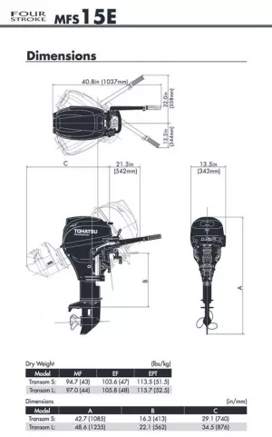 MFS 15 Die Tohatsu Viertaktmotoren MFS20 und 15 bieten Leistung, die nicht auf Kosten der Kraftstoffökonomie geht, verbunden mit einem exzellenten Leistungsgewicht und einer Bauweise, die härtesten Ansprüchen gerecht wird. Mit diesen Motoren unterstreicht Tohatsu einmal mehr seine Führungsrolle bei den kleineren Außenbordmotoren.
