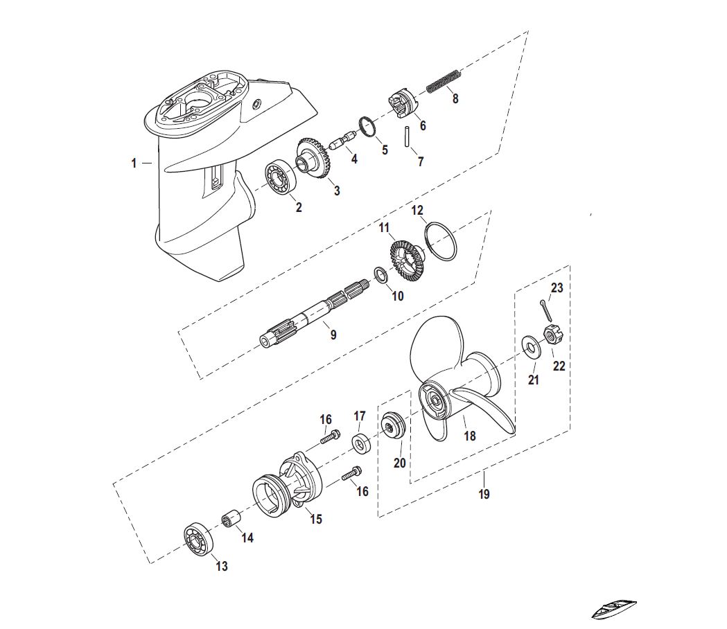 Getriebe Getriebgehäuse Unterwasserteil Propellerwelle Ersatzteileliste für F15EFI F20EFI Mercury Mariner Tohatsu 4Takt Außenborder Ersatzteilliste Originalteile Brunswick Quicksilver Einspritzmotoren