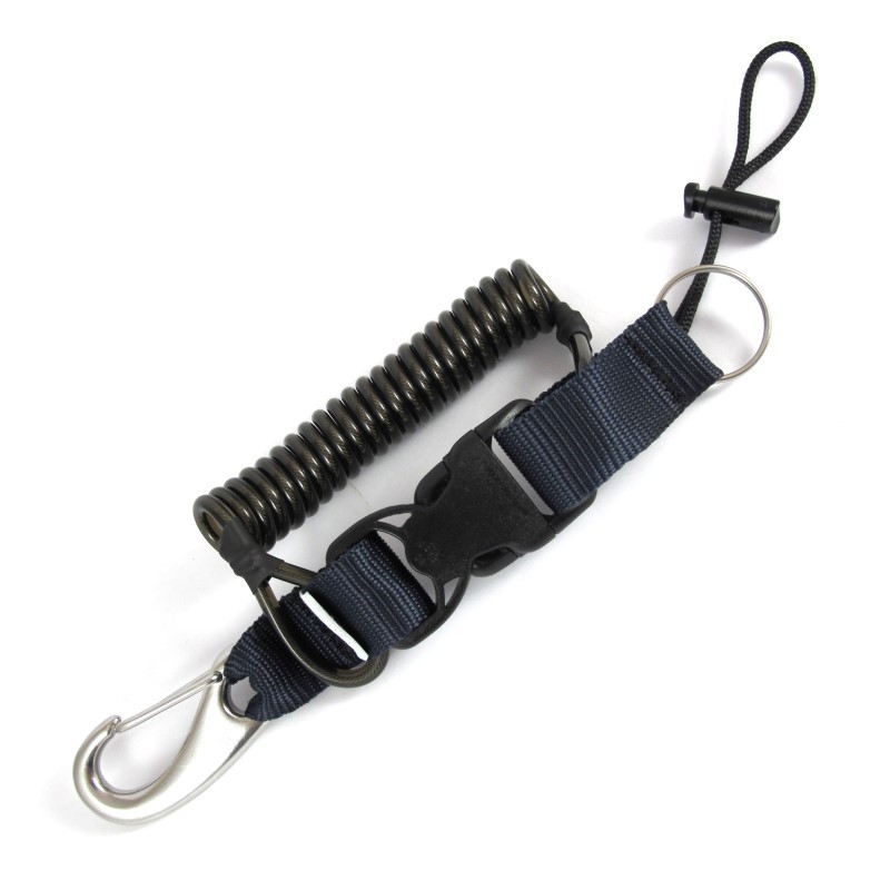 Hochwertige Edelstahl Spiralleine mit Karabiner 70mm auch aus Edelstahl. Die ausgezogene Länge von Karabiner bis Ring beträgt etwa 120 cm und kann mittels des Schnellverschlusses in der Mitte kurz gestellt werden. Der Edelstahlring ist sehr gut für die Befestigung an kleinen Öffnungen wie bei Kameras oder Lampen geeignet. Die zusätzliche Handleine hat einen Stopper zur Befestigung am Handgelenk oder an ungünstigen Ösen, wo der Ring nicht passen sollte.