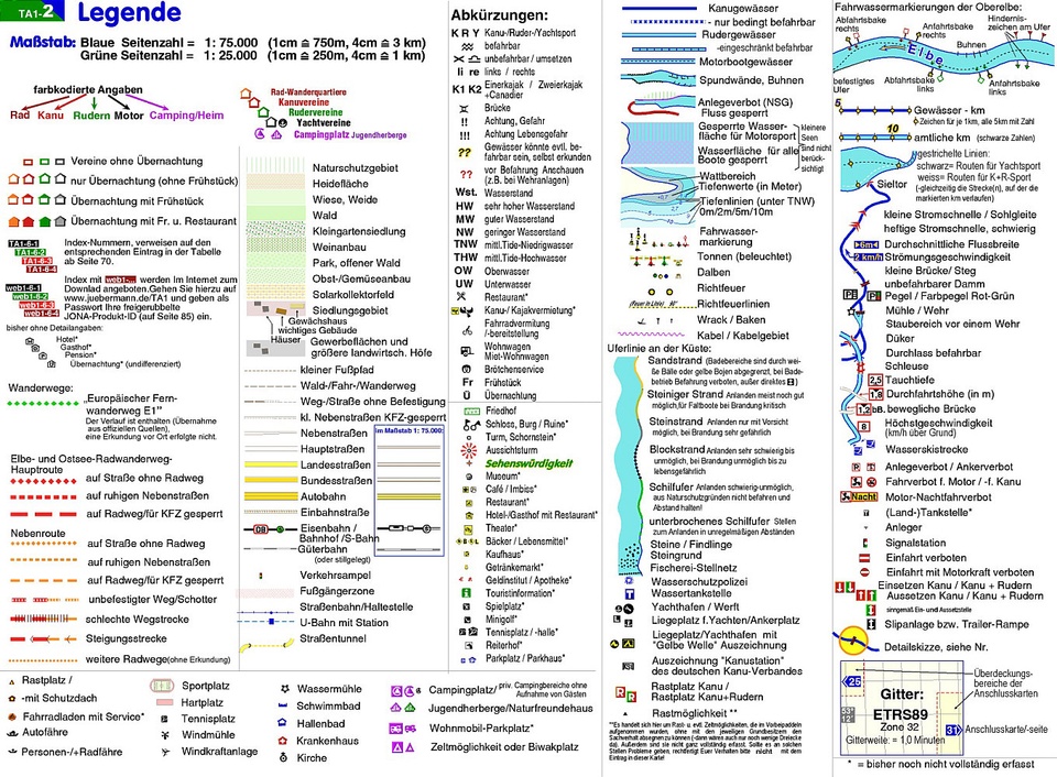 Dieser Atlas bieten alle Informationen, die der Wasserwanderer unterwegs benötigt : Gewässer-km, Anlande- u. Befahrungsverbote, Rast- und Biwakplätze, Liegeplätze, Slip-, Ein- und Ausstiegsmöglichkeiten, Betonnung, Tiefen, Brückenhöhen, Anschriften- und Ausstattungsliste der Vereine und Campingplätze, und eine Kartendarstellung, die nicht hinter´m Deich aufhört, also für Landausflüge oder Radtouren (zum Rückholen des PKW´s oder für große Radwanderungen) ebenso geeignet ist.
