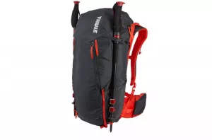 Bequemes Transportieren von Trekking-Stöcken am Hüftgurt mit dem beiliegenden Thule VersaClick Pole Holder, ohne dabei den Rucksack abzulegen